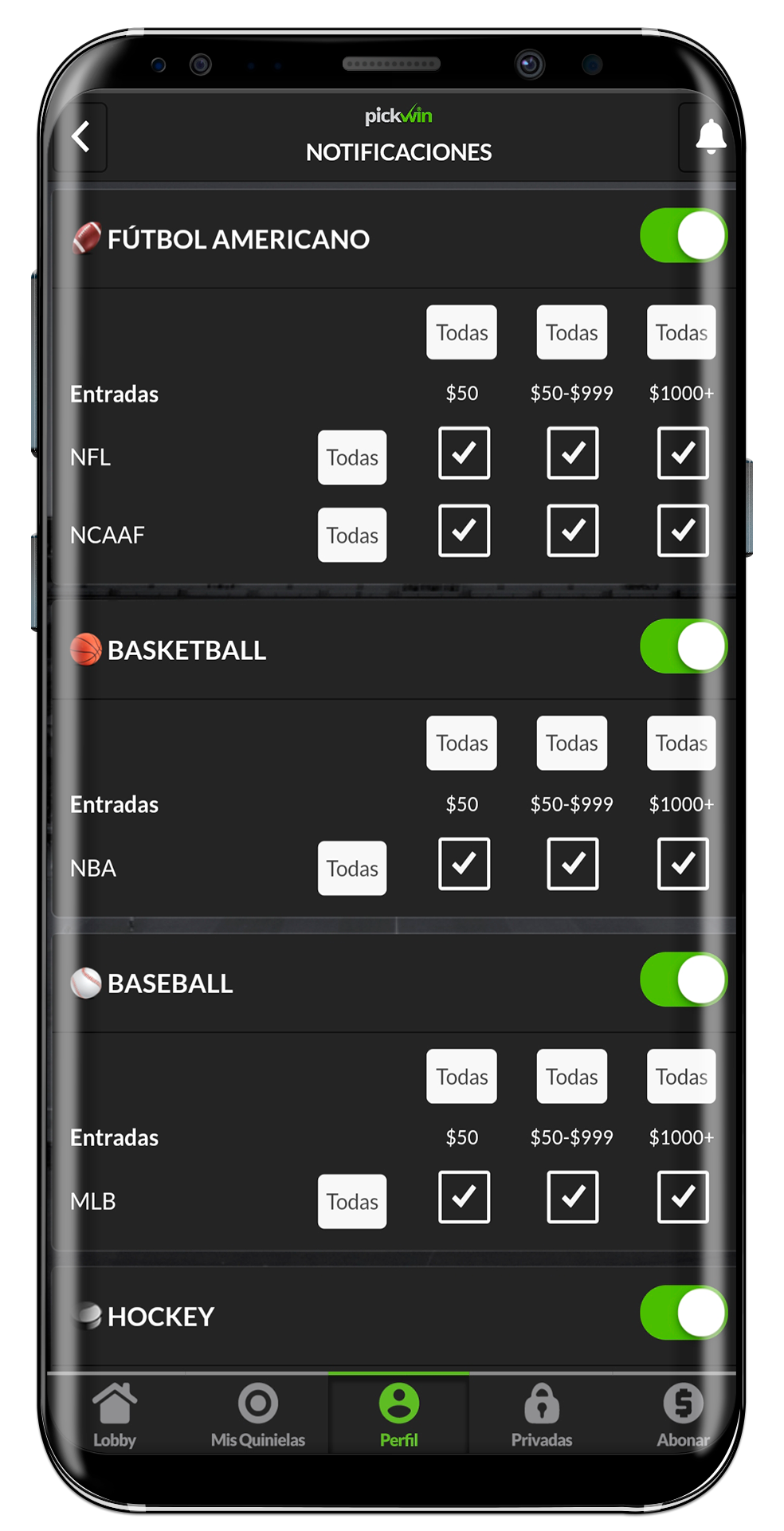 Escoge que notificaciones quieres recibir en tu app de Pickwin