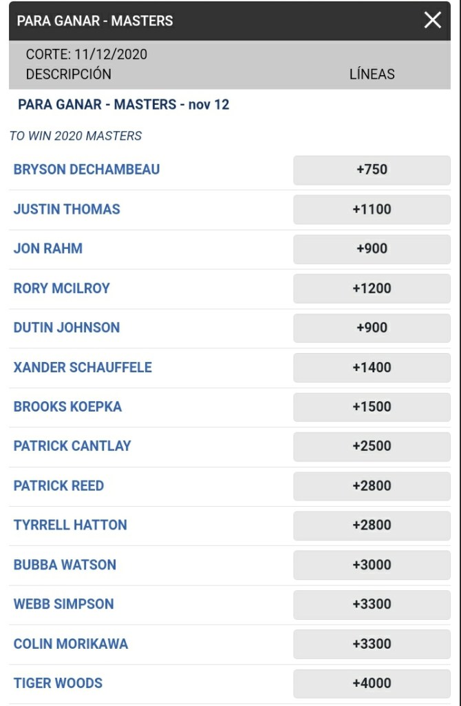Tiger Woods, el campeón defensor del Masters, llega con un momio de +4000 para ganar el torneo, habiendo terminado fuera del top 20 en sus últimos 7 torneos, aunque todos sabemos que Tiger está hecho para jugar y ganar Majors creo que este año no va a ser la ocasión.