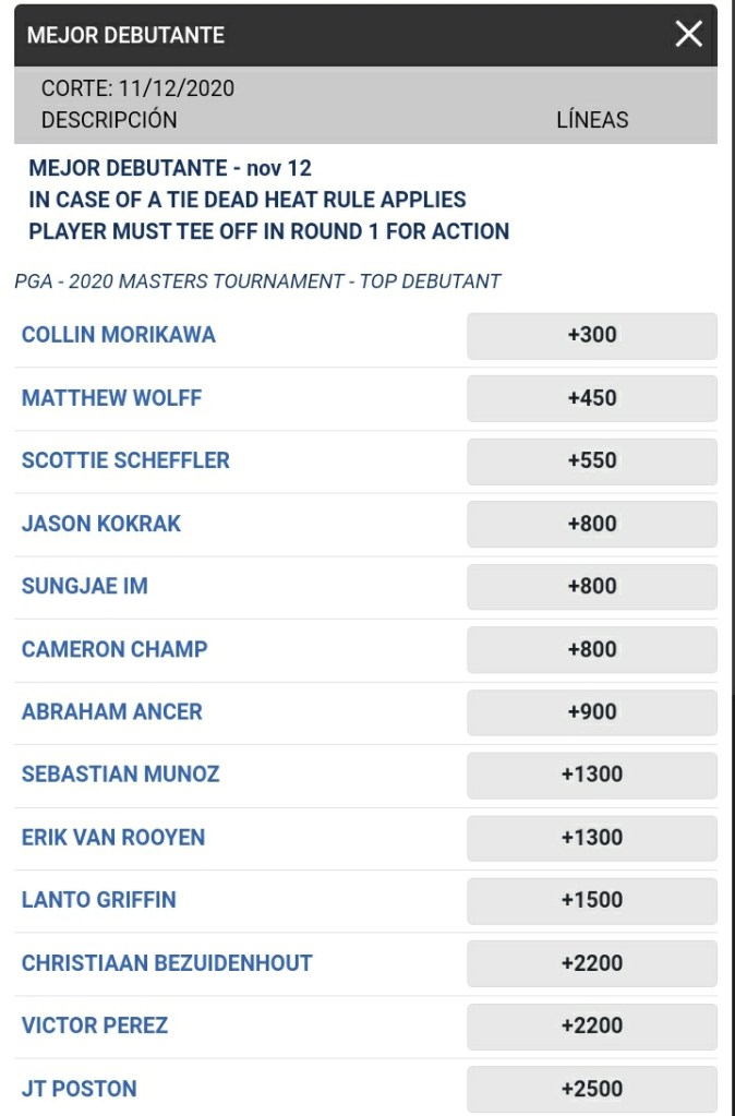 Ancer llega al Masters en el puesto 21 del ranking del PGA y paga 9-1 en caso de ser el mejor debutante este año en Augusta, tarea que se ve difícil ya que Colin Morikawa (+300) y Matthew Wolff (+450) son los favoritos en las casa de apuestas para ser el mejor primerizo.