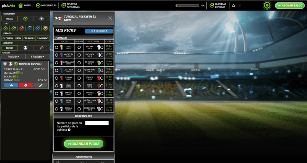 Hay algunas diferencias en la sección «Mis Quinielas» entre la versión web y móvil de Pickwin. En la versión web al dar clic sobre una quiniela se abre una versión en miniatura con la lista de tus picks. Puedes abrir varias quinielas por si quieres realizar ediciones o ver el resumen de tus quinielas sin tener que cambiar de ventana. Si quieres abrir una quiniela en ventana completa da clic en el botón «Ir a Quiniela».