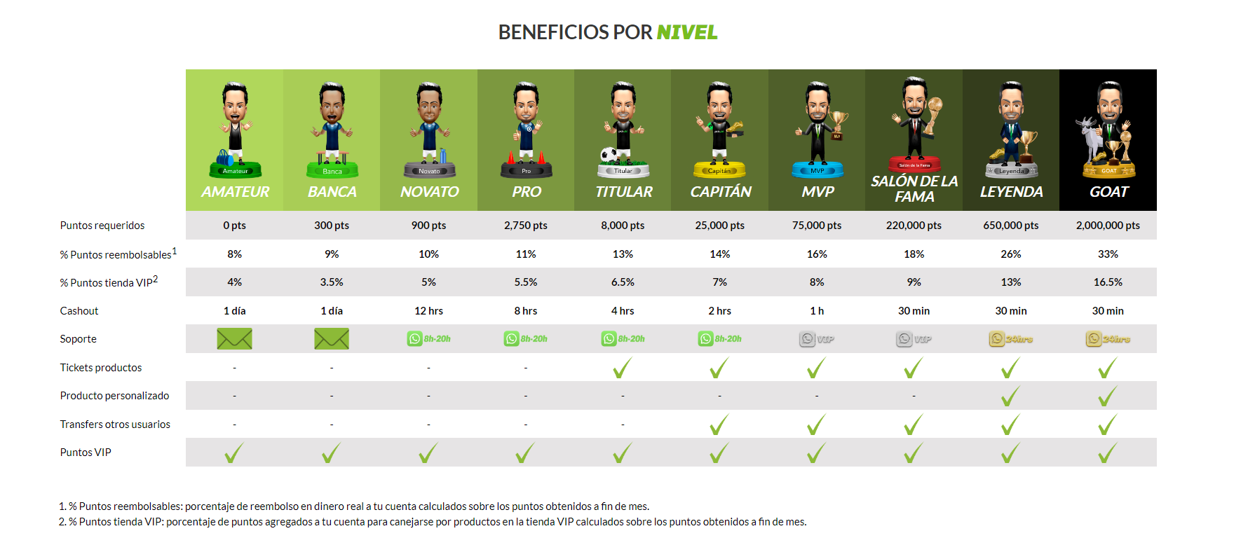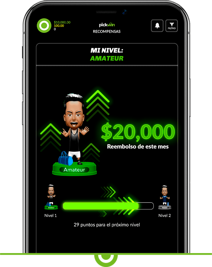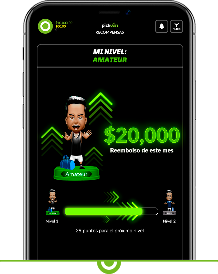 Con tus puntos sube de nivel para tener mayores beneficios. Al final de mes te regresamos un porcentaje de tus puntos en dinero real como saldo en Pickwin.