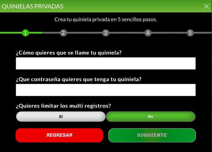 En la siguiente pantalla llena la información básica de tu quiniela: nombre, contraseña y si quieres limitar los multi-registros. Esto último se refiere a si quieres que un usuario pueda meter más de una quiniela o solamente una.