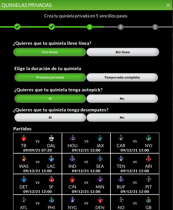 Elije fútbol americano para crear tu quiniela/survivor de la NFL.