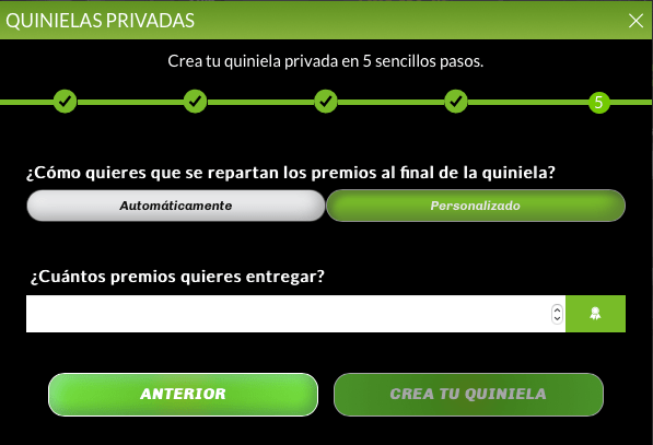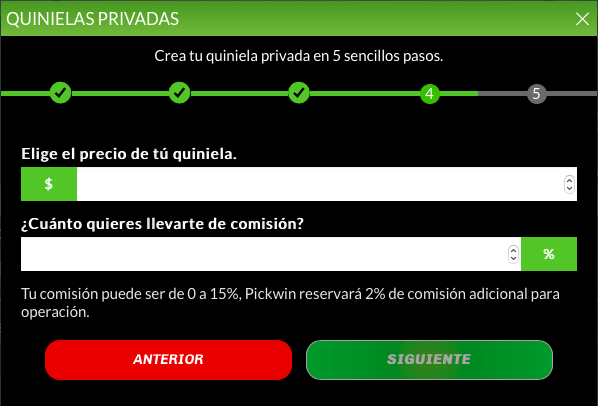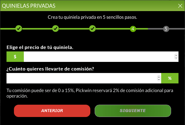 En el penúltimo paso te pedirá que pongas el precio de la quiniela y si ganarás una comisión como administrador.
