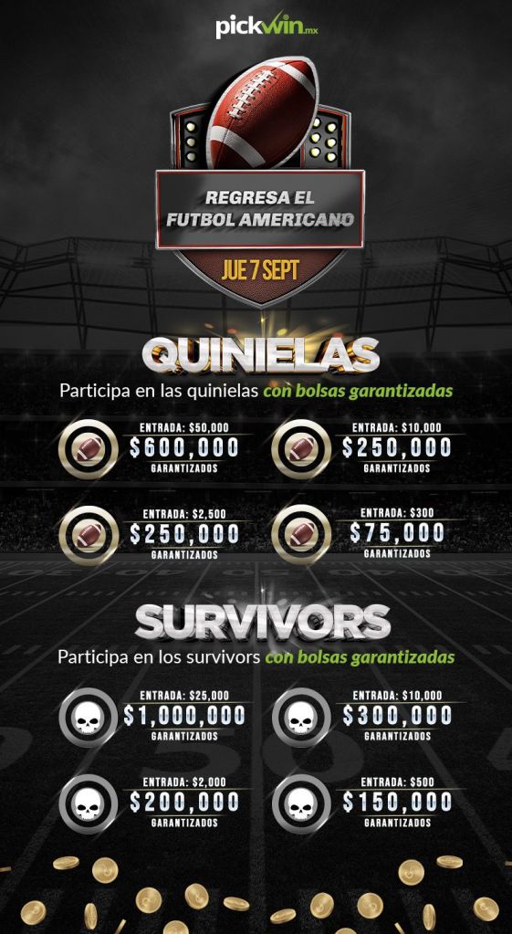 Llegó el momento esperado por todos los que extrañamos la NFL: serán meses de mucha actividad con el ingrediente más especial de todos… ¡más de 2 millónes de pesos en bolsas garantizadas con las quinielas de Pickwin!